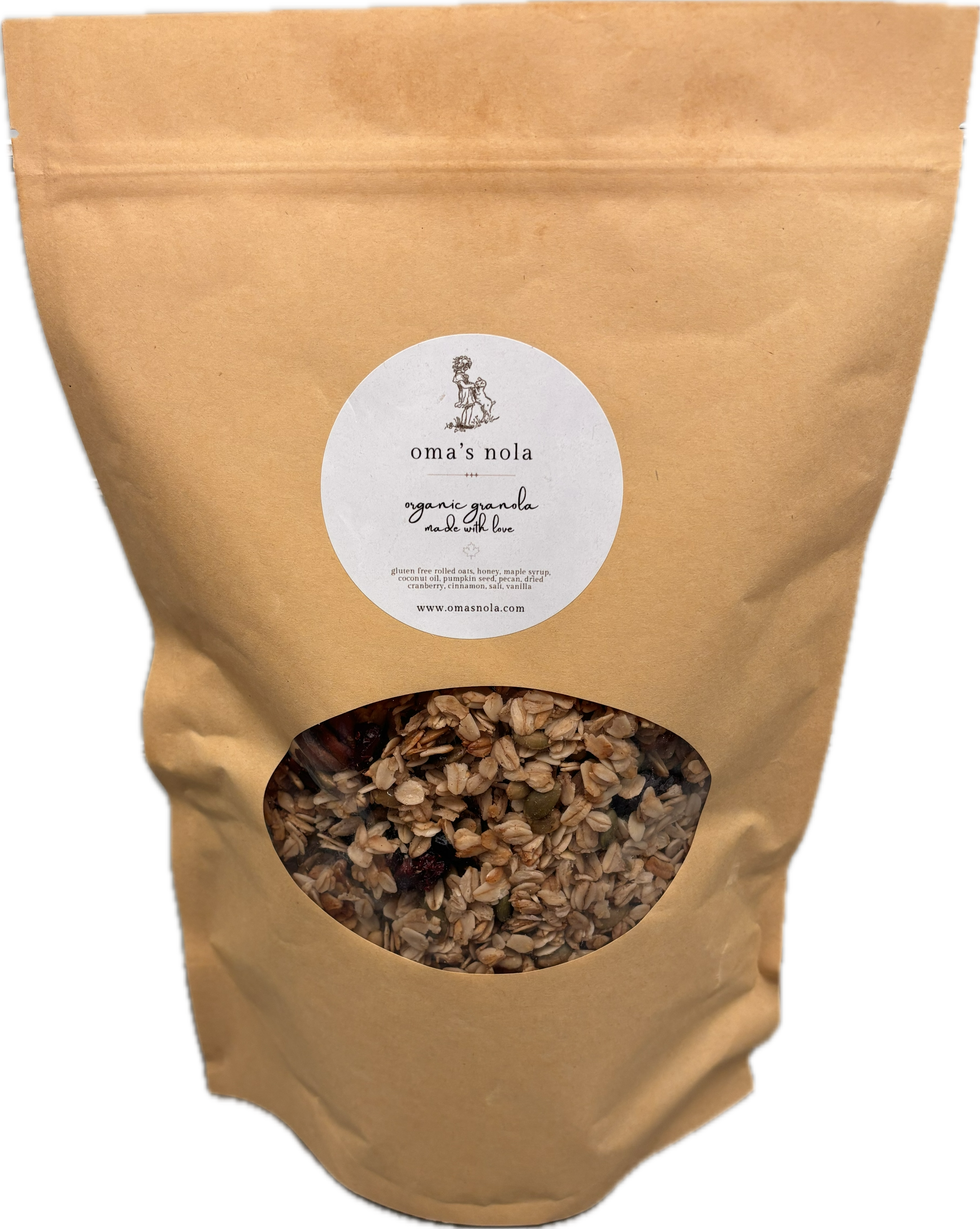 ingredients: gluten free sprouted rolled oats, honey, maple syrup, coconut oil, pumpkin seed, pecan, dried cranberry, cinnamon, salt, vanilla